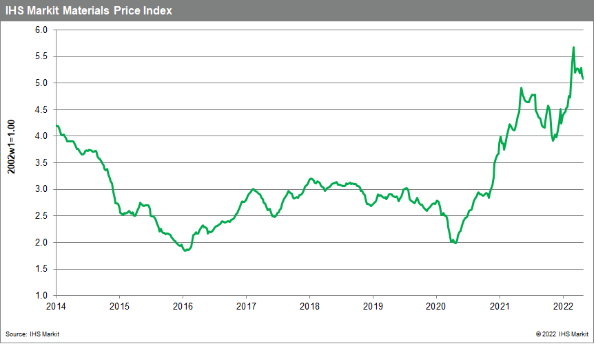 Our Materials Price Index (MPI) declined 3.5% last week, its fifth consecutive weekly decline. The sell-off was again broad with nine out of ten subcomponents falling, highlighting the downward momentum in commodity prices over the past four months -- the MPI is now 20% lower than its all-time high established back in early March. Significantly, commodity prices over the previous 12-months are declining for the first time since October 2020 with the MPI 5% lower than this time last year.