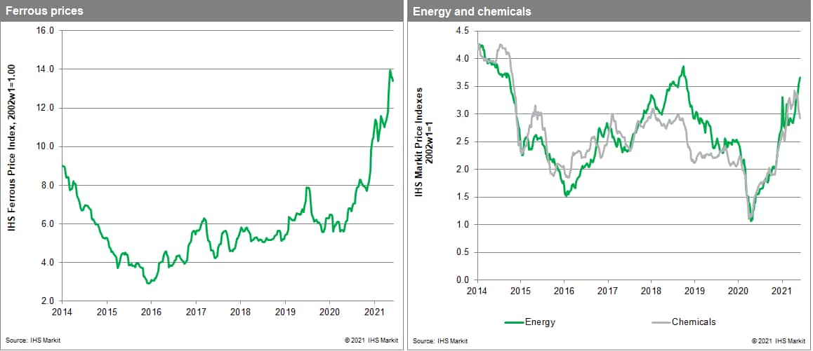 This past week provided more evidence that the year-long rally in commodity markets may finally be ebbing. However, despite the giveback, past commodity price increases continue to put pressure on producers. China's producer price index for May rose 9% year on year driven by increases in oil, non-ferrous, and iron ore prices, prompting action by the national government to rein in prices. In the United States, even the top-line consumer price index is showing a sharp acceleration in inflation rising 5.0% year over year in May (although the pace has eased on a month to month basis). Some of the fastest rising components were for vehicles and transportation. Similar to commodities, we do not think these increases will be sustained as markets adjust, a pattern we are beginning to now see upstream in supply chains for raw materials.