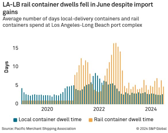 LA-LB rail container dwells fell in June despite import gains Average number of days local-delivery containers and rail containers spend at Los Angeles-Long Beach port complex