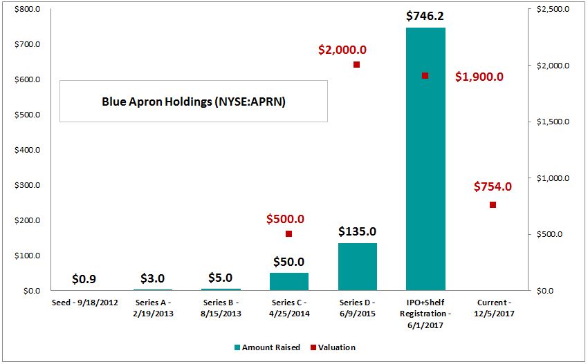 Next, we looked at public company comparables, including two recent subscription box companies that went public in 2017. Blue Apron Holdings Inc. (NYSE:APRN), which provides subscribers with cooking ingredients and recipes, debuted in late June at $10 a share and a $1.9B market capitalization. Public markets have not been kind to this stock, and prices have faltered. As of early December, it was trading below $4 a share with a market capitalization of less than $750MM. Bessemer Venture Partners currently owns slightly over 19% of total shares outstanding, which is valued around $135MM. In aggregate, private equity firms own 33.3% of total shares outstanding.