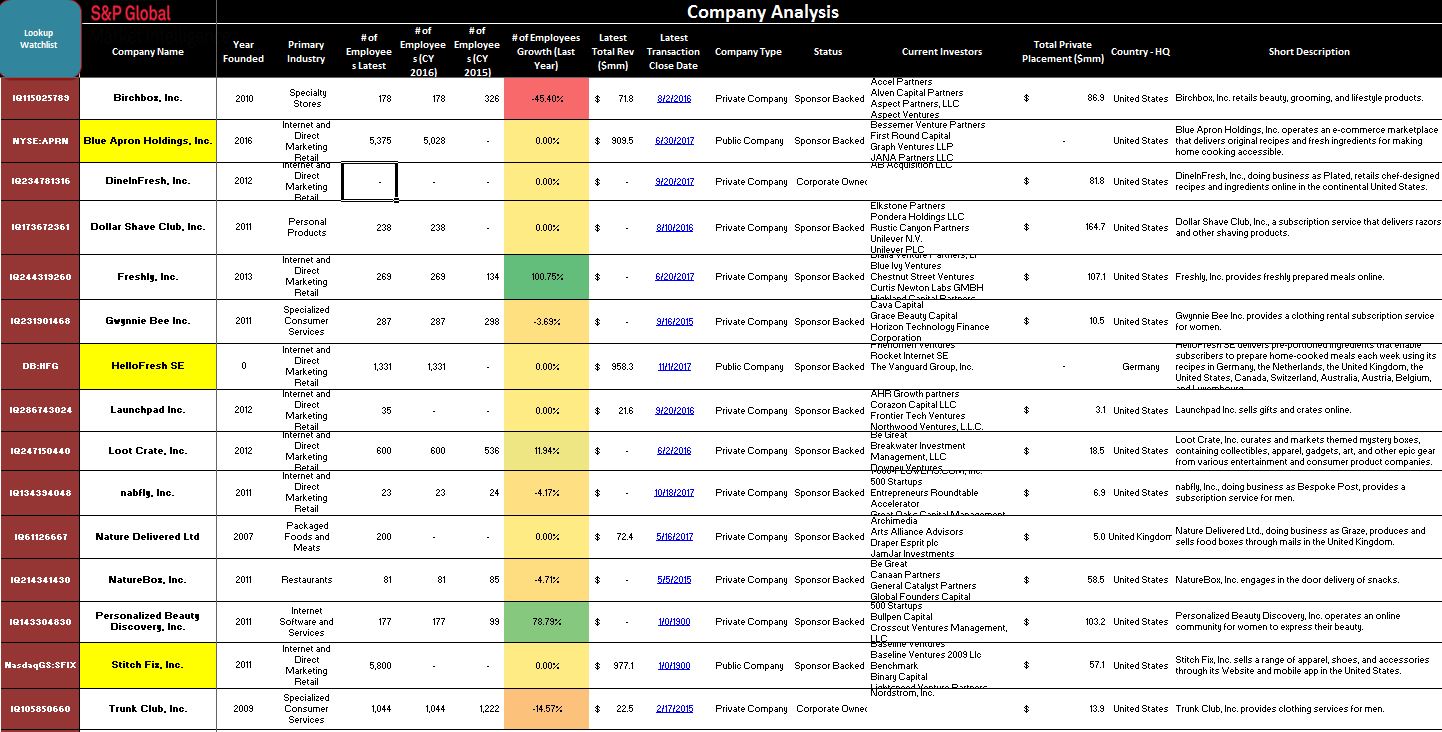 We used the S&P Capital IQ platform to analyze private, corporate-owned, and public subscription box companies, including a few that recently went public (most notably Blue Apron). We pulled company financials, layered in basic details like founding year, location, and product offering, and added in our employee headcount data sourced from Department of Labor 5500 forms to help assess growth rates, as shown in the chart below.