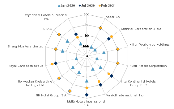 At the beginning of 2020, the S&P Global RiskGauge scores for the majority of companies in the sample congregated in the lower investment-grade, higher speculative-grade space. However, the global nature of the pandemic, accompanied by government-imposed restrictions, severely impacted creditworthiness in this sector. By July 2020, S&P Global RiskGauge scores of the selected companies deteriorated substantially towards an average score of ‘b’, reflecting the breadth and depth of the COVID-19 impacts. In the second half of 2020, companies mostly managed to shore up their financials, limiting further deteriorations in credit scores. Some large hotel chains, such as Meliá Hotels International, S.A., Marriott International, Inc., and InterContinental Hotels Group PLC, are already seeing tentative signs of recovery and small improvements in their credit scores. However, an overall still weak credit risk profile points to high sensitivity to further prolonged operational disruptions and a long way ahead to get back to smooth sailing.