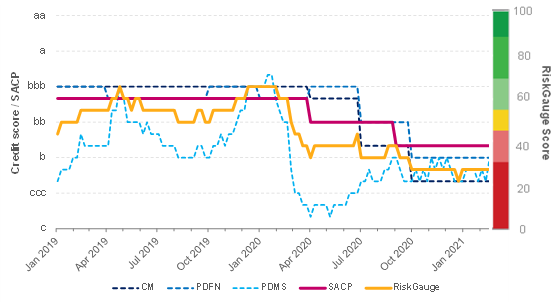 The S&P Global RiskGauge score, driven by PDMS’s early-warning characteristics, promptly reacted to these adverse market conditions and indicated a distressed outlook, resulting in a multiple notch deterioration. As each subsequent quarterly financial statement for the company showed progressively weaker financial fundamentals, the S&P Global RiskGauge score deteriorated further, leveling off at ‘b-’ by the end of 2020. Throughout 2020, S&P Global Ratings’ SACP was also downgraded multiple times, ending 2020 at ‘b+’. It was placed on CreditWatch negative, reflecting a heightened likelihood of further downgrade within the next few months.[8] Here we also note that the S&P Global RiskGauge score deteriorated a few weeks prior to the consecutive changes in the S&P Global Ratings SACP, providing a timely early warning signal of elevated credit risk.