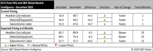 The S&P Global PEG Engineering and Construction Cost Index (ECCI) is a diffusion index based on data independently obtained and compiled by S&P Global from procurement executives from leading engineering, procurement, and construction firms. The headline index tracks industry specific trends and variations, identifying market turning points for key projects, and is intended to act as a leading indicator for wage and material inflation specific to this industry. Each survey response is weighted equally for every $2 billion in spending in North America. Respondents are asked whether prices (either actual paid transactions or company-informed transactions) this month for individual materials, equipment, and regional subcontractor rates, were higher, lower or the same as the prior month. Respondents are then asked for their 6 month pricing expectations among these same subcategories. The results are compiled into diffusion indexes, whereby a reading greater than 50 represents upward pricing strength and a reading below 50 represents downward pricing strength.
