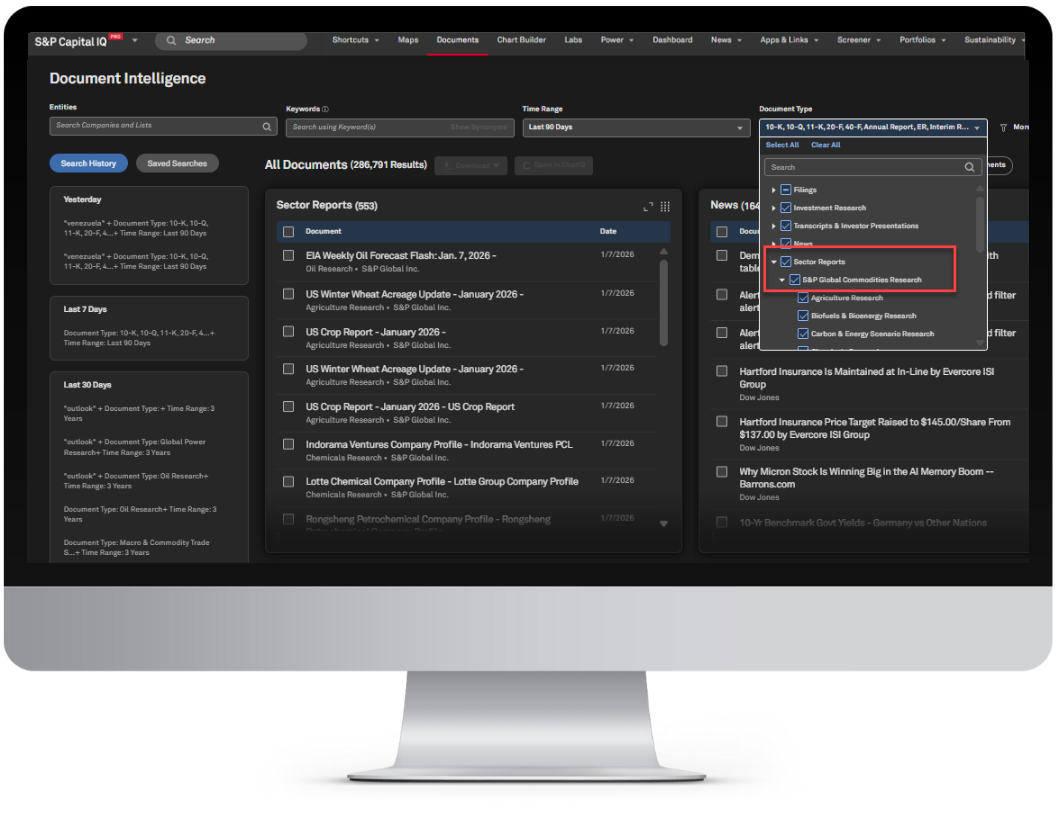 Efficiently discover, analyze, and extract our new industry reports and news across text-based content, including Filings, Transcripts, News, and Investment Research via our Document Intelligence tool.