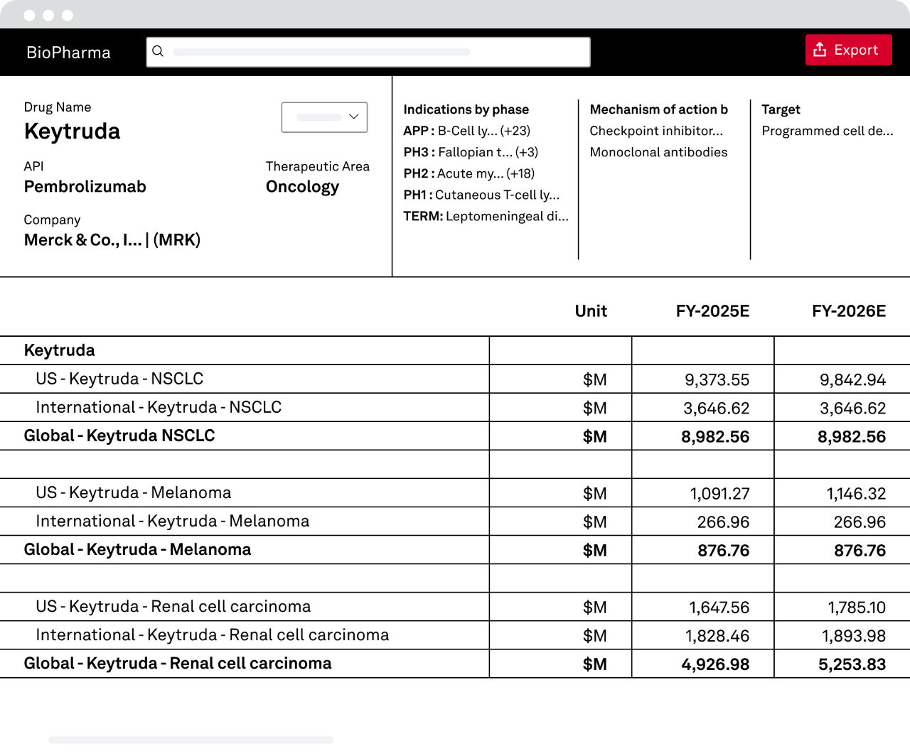 Within BioPharma, you can filter drugs by 20+ attributes for more comprehensive analysis, including forward-looking financials, parent company, clinical trial phase, indication, and MOA.