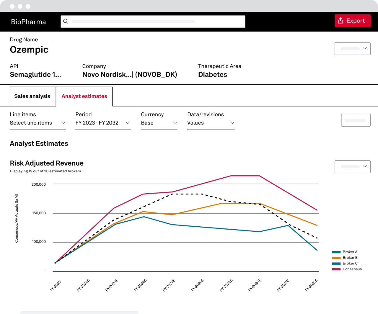 While traditional vendors rely solely on research reports, all estimates in BioPharma are sourced directly from the full working models of over 260 contributing brokers, offering a more objective view.