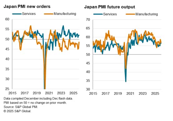 Business activity in Japan continued to grow in the final month of 2025, according to the flash PMI data by S&P Global. While the rate of output growth decelerated from November, fresh increases in new and backlogged orders pointed to the likelihood for business activity growth to be sustained into the new year. This brighter picture was further reinforced by the quickest rise in headcounts in just over one-and-a-half years and still-elevated confidence regarding future output.