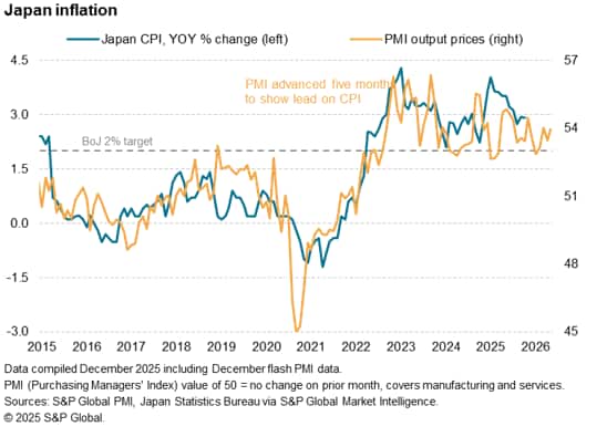 Although services firms were able to pass their additional cost burdens onto clients, subdued goods demand curbed manufacturers' ability to raise output prices at a quicker pace. Overall, however, output charges still rose at a pace that was quicker than in November and above the 12-month average. The latest rate of output price inflation was also indicative of consumer price inflation continuing to run above the Bank of Japan's 2% target into the start of 2026, with greater potential to rise if companies opt to further pass on their increasing cost burdens to customers.