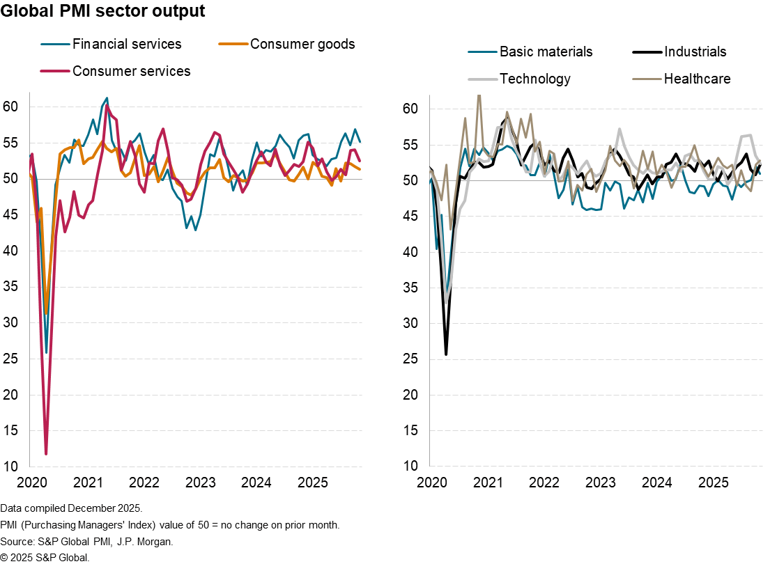 Global economic growth remained robust in November, according to PMI survey data, though growth was heavily reliant on a further strong expansion of financial services activity, in turn linked to supportive global financial conditions. In contrast, many other sectors remained mired in only modest or slowing growth, though notably only one sector - autos - reported falling output.