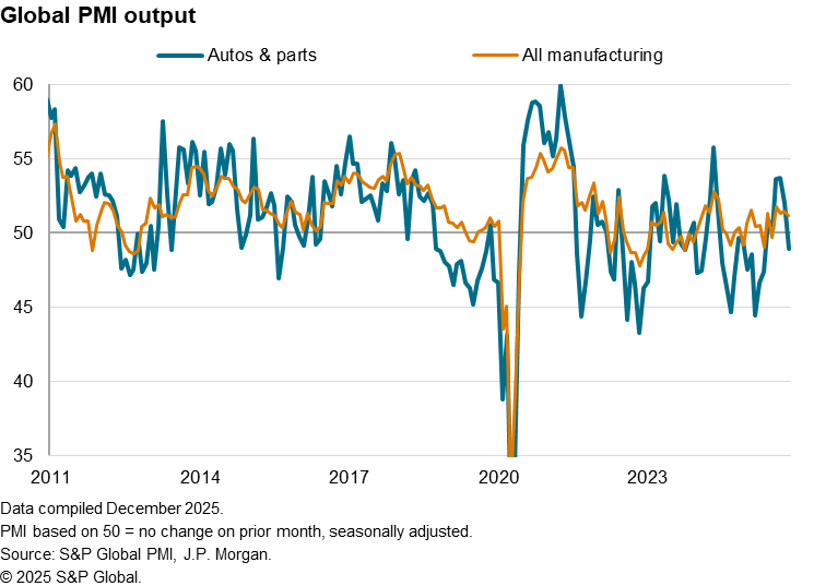 The worst performer, and in fact the only sector reporting a fall in output in November, was automobiles and auto parts. November's fall in auto sector output was the first in six months, and was blamed in part on the fading impact of US tariff policies. Demand for vehicles had been buoyed over the summer as buyers sought to beat potential tariff price rises. November's decline therefore represents something of a return to the pre-tariff trend of falling production globally.