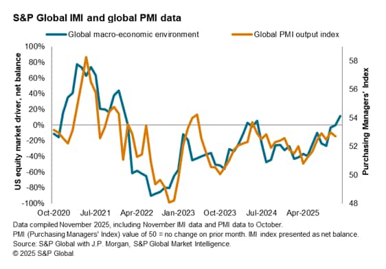 The latest S&P Global Investment Manager Index (IMI) indicated that risk sentiment further improved among US equity investors at the start of December. Optimism regarding both fiscal and monetary policy picked up while concerns over the political environment and valuations eased. Notably, positive sentiment returned for the global macroeconomic environment for the first time in one-and-a-half years, hinting at the rising expectation for stronger global economic growth in the near-term.