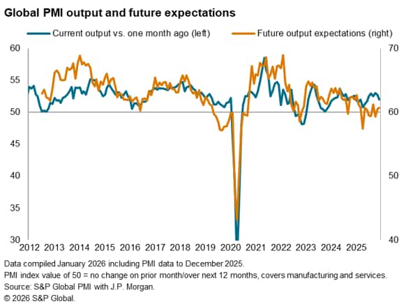 Over much of 2025 the worldwide PMI surveys tracked an unusual divergence whereby robust, resilient global business output growth (and GDP) contrasted with historically subdued levels of business confidence (as measured by firms' expectations of growth over the coming year). Doubts over whether this resilience can be sustained into 2026 were raised by output growth succumbing to a six-month low in December. January's PMI data, due in the coming week, will therefore provide new insights into these output and sentiment trends, and likely set the scene for the global economic outlook over 2026.