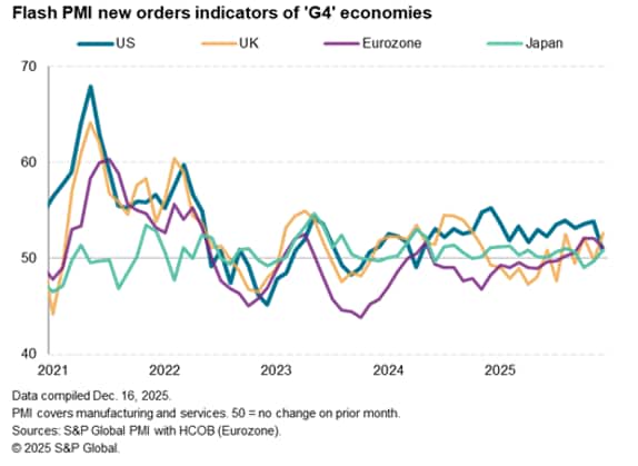 S&P Global's flash PMI surveys showed output rising across all four largest developed economies (the "G4") for an eighth successive month in December. However, while the US continued to lead the expansion, as has been the case for much of the past two years, its outperformance has narrowed to the smallest seen over these past eight months. Furthermore, the forward-looking new orders index comparisons now show the US to be the worst performer of the G4 in December, with demand reportedly impacted in part by tariff-related price rises.