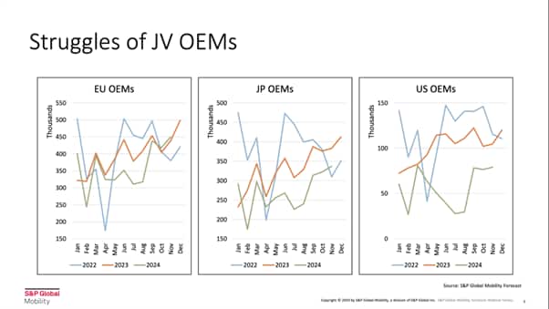 図は、ヨーロッパ、日本、アメリカのOEMにおける、過去3年間の月別販売台数を比較したものです。ここではジョイントベンチャーOEMの現状と今後について、解説します。