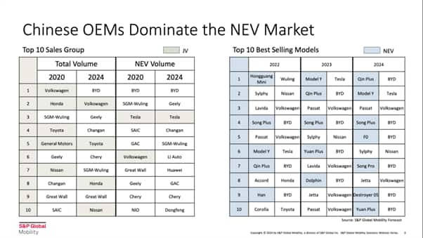 またNEVの販売台数において、トップ10にランクインしているのはすべて中国系OEMです。2020年にはTeslaとVolkswagenがランクインしていますが、2024年はTesla以外の外資系がランク外に転落しています。