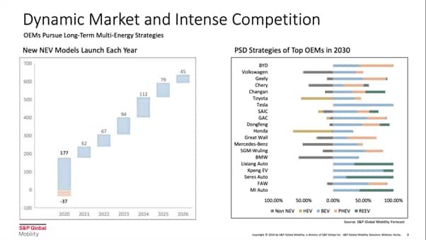 中国ではNEVの新モデルの市場投入が非常に活発であり、2026年までにおよそ700弱ものモデルがリリースされる見込みです。