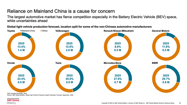 現在、多くのOEMが直面している大きな課題の一つが、中国市場への依存です。上記は、2025年の生産予測データをもとに、中国以外の主要自動車メーカーがどの程度中国市場に依存しているかを示しています。