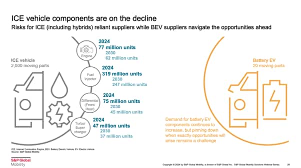 ハイブリッド車を含むICE車両には約2,000個の可動部品が使用されていますが、BEVではその数がわずか20個程度に減少します。この違いにより、ICE部品の需要は減少する一方、BEV部品の需要は今後も増加すると見込まれています。