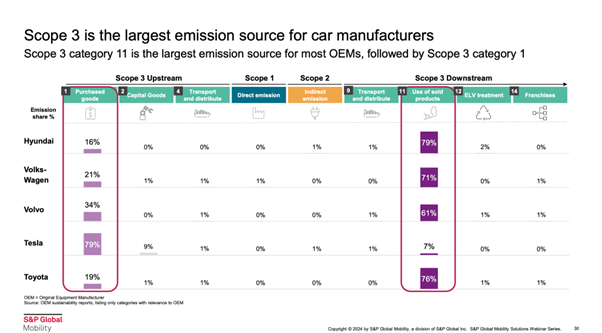 テスラと他のOEMを比較すると、興味深い違いが見られます。テスラの場合、販売するのはBEVのみであるため、カテゴリー11における排出量は全体の7%と比較的低い割合です。