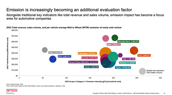 総収益や販売台数といった従来の主要指標に加え、温室効果ガス排出量の影響が、OEMの評価基準としてますます重要になっています。上記は、主要OEMの2023年における新車販売総収益、販売台数、1台あたりの平均WTW排出量です。