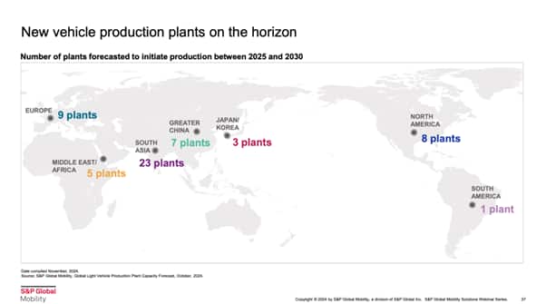 上記のデータは、2025年から2030年にかけて新たに生産を開始すると予測される自動車工場の数を示したものです。