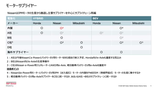 B社は、日産向けの e-Axle生産の準備を進めている段階です。C社は、日産のe-Power用ジェネレーター、AWD用e-Axleおよび軽自動車向けバッテリーEV用のe-Axleを量産中です。
