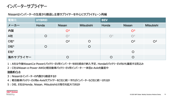 続いて、インバーターサプライヤーへの影響です。日産はインバーターの自社生産から撤退し、主要サプライヤーを中心にサプライチェーンの再編を進めている状況です。