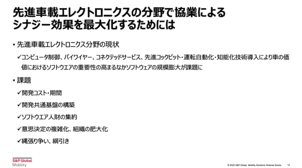 続いて、SDV(ソフトウェア・ディファインド・ビークル)の観点から、両社の協業についての課題を解説します。SDVは、資本や人材不足の観点から常に協業を検討できる分野として位置付けられています。