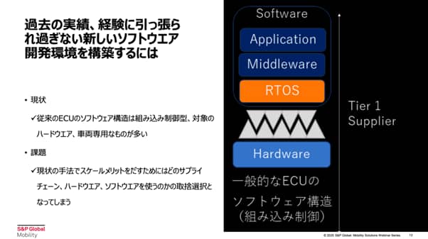 従来のECUのソフトウェア構造では、各車両やハードウェアに最適化された組み込み型が主流でした。そのため開発ごとに異なる仕様が求められ、異なるメーカー間でのリソース共有が難しいという課題がありました。