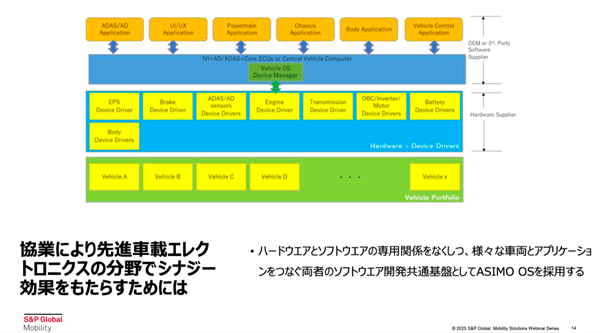 こうした課題を解決し、車載エレクトロニクス分野でのシナジー効果を最大化するには、 ハードウェアとソフトウェアの専用設計をなくし、共通基盤を活用することが重要です。具体的には「ASIMO OS」を導入することで、異なる車両やアプリケーションを統一されたプラットフォーム上で動作させることが可能となります。