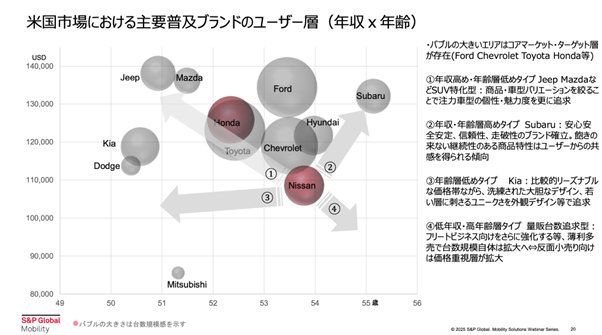 上表は、米国市場における主要ブランドのユーザー層を年収と年齢で示したものです。バブルの大きいエリアは、コアマーケット・ターゲット層が存在(Ford、Chevrolet、Toyota、Hondaなど)しています。