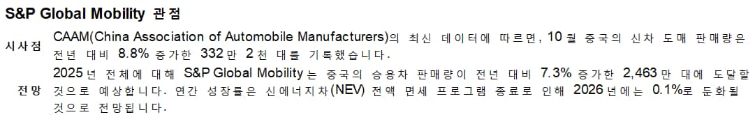 10월 신에너지차(NEVs) 수출은 2024년 동월 대비 두 배가 되는 기록적인 물량을 유지했습니다. 플러그인 하이브리드 차량(PHEV)의 선적 물량은 2025년 첫 10개월간 전년 동기 대비 220% 이상 급증하여 71만 대를 초과했습니다. 이러한 급증은 중국 자동차 제조사들이 글로벌 완성차 제조사의 내연기관차(ICE) 및 완전 하이브리드 모델과 경쟁하기 위해 유럽, 남미, 중동 시장에서 플러그인 하이브리드 차량(PHEV) 공급을 확대하는 전략을 반영합니다. 2025년 한 해 동안 S&P Global Mobility는 중국 승용차 판매량이 전년 동기 대비 7.3% 증가한 2,463만 대에 이를 것으로 예상합니다. 이러한 연간 성장률은 신에너지차(NEV) 완전 면세 프로그램의 종료로 인해 2026년에는 0.1%로 둔화될 것으로 전망됩니다.