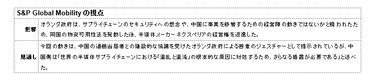 オランダ政府は水曜日、中国当局との建設的な協議の後、中国所有のチップメーカーネクスペリアへの介入を停止したと述べた。オランダのカレマンス経済相はソーシャルメディアプラットフォームの「X」に投稿した声明で、「これは善意の表れだと考えている」と述べた。オランダ経済省は、物資可用性法に基づく命令を停止することで、同国は「建設的な一歩を踏み出す適切なタイミングである」と判断したと述べている。今後数週間にわたって中国当局と協議を続けるとした。中国商務省は11月19日、ネクスペリアをめぐる現在の状況に関する質問に対し、介入停止は「正しい方向への第一歩」であるが、世界的な半導体サプライチェーンにおける「混乱と混沌」の根本的な原因に対処するために、より多くのことを行う必要があると述べた。中国商務省は、オランダの動きは、中国が要求していた介入の完全な停止には至らなかったと述べた。9月、オランダ政府は冷戦時代の法律を発動し、中国のウィングテックが所有するネクスペリアを事実上支配下に置いた。オランダ政府は-自動車や家電などの産業で使用されるチップの大量生産を専門とする-同社の技術が「緊急時に利用できなくなる」恐れがあると指摘した。この介入は中国の強い反発を招き、中国で組み立てられたネクスペリアの完成品の輸出禁止を発表する結果となった。中国は11月上旬、ネクスペリア製の民生用チップの輸出規制を免除した。同省は一貫して、世界的な半導体サプライチェーンを保護しており、オランダ政府は紛争解決に向けた役割を果たしていないと主張している。同社の中国部門であるネクスペリア・チャイナは、オランダ政府の介入停止の動きについてまだコメントしていない。ネクスペリア・チャイナは、オランダ政府がチップメーカーの支配権を取得する動きを受けて、オランダ本社から独立して運営しようとしている。同中国部門は10月24日、グローバルセールス&マーケティング責任者のジョン・チャン氏の雇用状況を確認し、法的権利を擁護する声明を発表した。また、中国の従業員に対し、給与と福利厚生の全額を支払う能力があることを保証した。