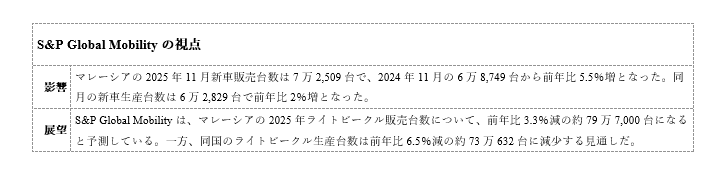 中長期的には、所得の増加と低インフレに支えられた消費支出の拡大を背景に、市場は成長が見込まれている。ただし、人口1,000人当たり500台超というマレーシアの高いモータリゼーション率を踏まえると、成長は横ばい基調が続く可能性もある。さらに、人件費の上昇により、海外直接投資がカンボジアやベトナムといった、より低コストのASEAN諸国へシフトする動きが強まる可能性がある。 なお、当社のライトビークル販売および生産データには、乗用車および小型商用車が含まれている。