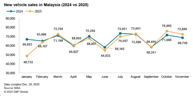 マレーシア自動車協会(Malaysian Automotive Association:MAA)が公表した統計および現地メディアの報道によると、2025年11月のマレーシアにおける新車販売台数は7万2,509台で、2024年11月の6万8,749台から前年比5.5%増となった。なお、この月次データにはBMW Group、Mercedes-Benz、Kia、Peugeot、Scania、およびGreat Wall Motor(GWM、2024年3月以降除外)の販売実績は含まれていない。