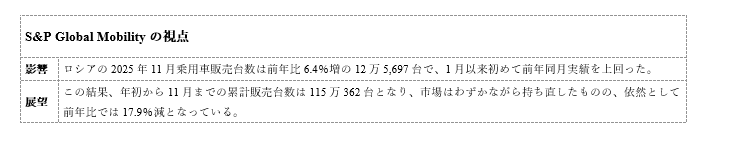 ロシアの2025年11月乗用車販売台数は前年比6.4%増の12万5,697台で、1月以来初めて前年同月実績を上回った。その主な要因は、2024年11月の販売水準が低かったことに加え、ロシア政府が2026年1月から導入予定の新たな車両スクラップ料金制度を前にした駆け込み需要の影響によるものである。この結果、年初から11月までの累計販売台数は115万362台となり、市場はわずかながら持ち直したものの、依然として前年比では17.9%減となっている。