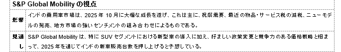 これらの課題にもかかわらず、年間予算における個人所得税率の引き下げやGSTの削減を含むインド政府の最近の措置は、業界の利害関係者に楽観的な見方を植え付けている。こうした政策変更が個人消費を押し上げ、自動車購入を後押ししている。S&P Global Mobilityは、特にSUVセグメントにおける新型車の導入に加え、買い替え需要や好ましい政策変更、競争力のある価格戦略、新工場での生産が2025年のインドの新車販売を押し上げると予想している。当社は、2025年のライトビークル生産台数は控えめな前年比0.8%減の約494万台になる予想している。
