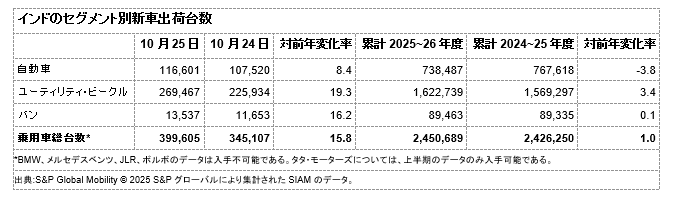 インド自動車工業会 (SIAM) が発表した10月の自動車卸売統計によると、月中のインドのディーラーへの乗用車の総出荷台数は前年比15.8%増の399,605台であった。乗用車には乗用車、ユーティリティ・ビークル (UV)、バンが含まれ、小売販売ではなく、自動車メーカーがディーラーに出荷する車両を示す。10月のセグメント別の乗用車の出荷台数は、前年比8.4%増の116,601台、UVの出荷台数が19.3%増の269,467台、バンの出荷台数が16.2%増の13,537台であった。2025~26年度の4月~10月の累計出荷台数は、前年比1.0%増の約245万台となった。