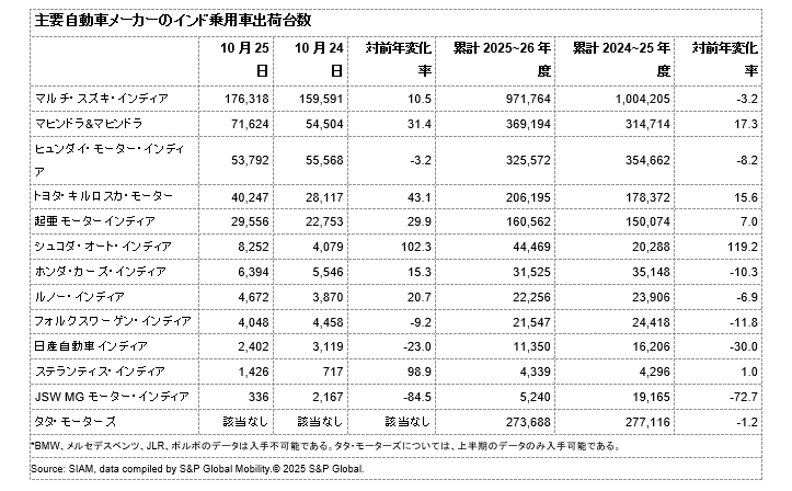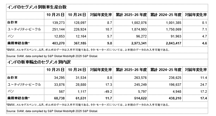 SIAMのデータにはタタ・モーターズの月次販売台数は含まれていないが、同自動車メーカーの2025-26年度上期 (4月~9月) の乗用車販売台数は前年比1.2%減の273,688台であった。一方、企業の声明によると、同自動車メーカーが10月にディーラーに出荷したEVを含む乗用車は61,134台で、前年比27.0%増となった。