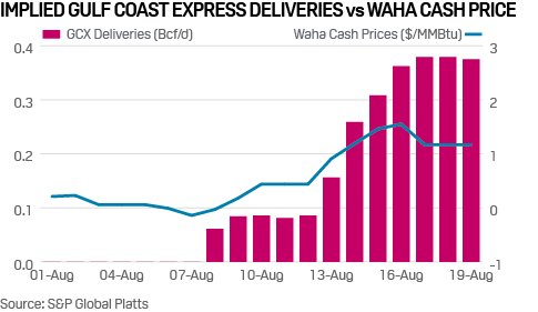 Prices at Waha have been notably higher since flows from El Paso to Gulf Coast Express began earlier this month. On August 15, Waha changed hands at $1.55/MMBtu which was the highest level the location has seen since trading at $2.36/MMBtu on March 15.
