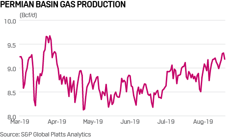 Including local demand, which is capable of absorbing about 700 MMcf/d, Permian gas production becomes fully constrained around 9.4 Bcf/d, according to Platts Analytics.