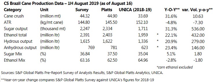 Sao Paulo — The sugarcane crush in the key Center-South region of Brazil is expected to total 44.32 million mt in the first half of August, an increase of 31.6% on the year, an S&P Global Platts survey of analysts showed Thursday.