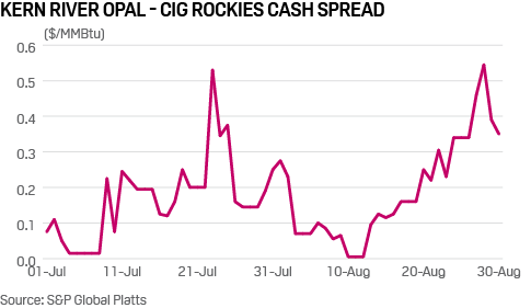 Since the startup of maintenance, higher Sumas prices have cleaved the Rockies gas market, moving Wyoming's Kern River Opal hub to a sharp premium to the state's nearby CIG Rockies location.