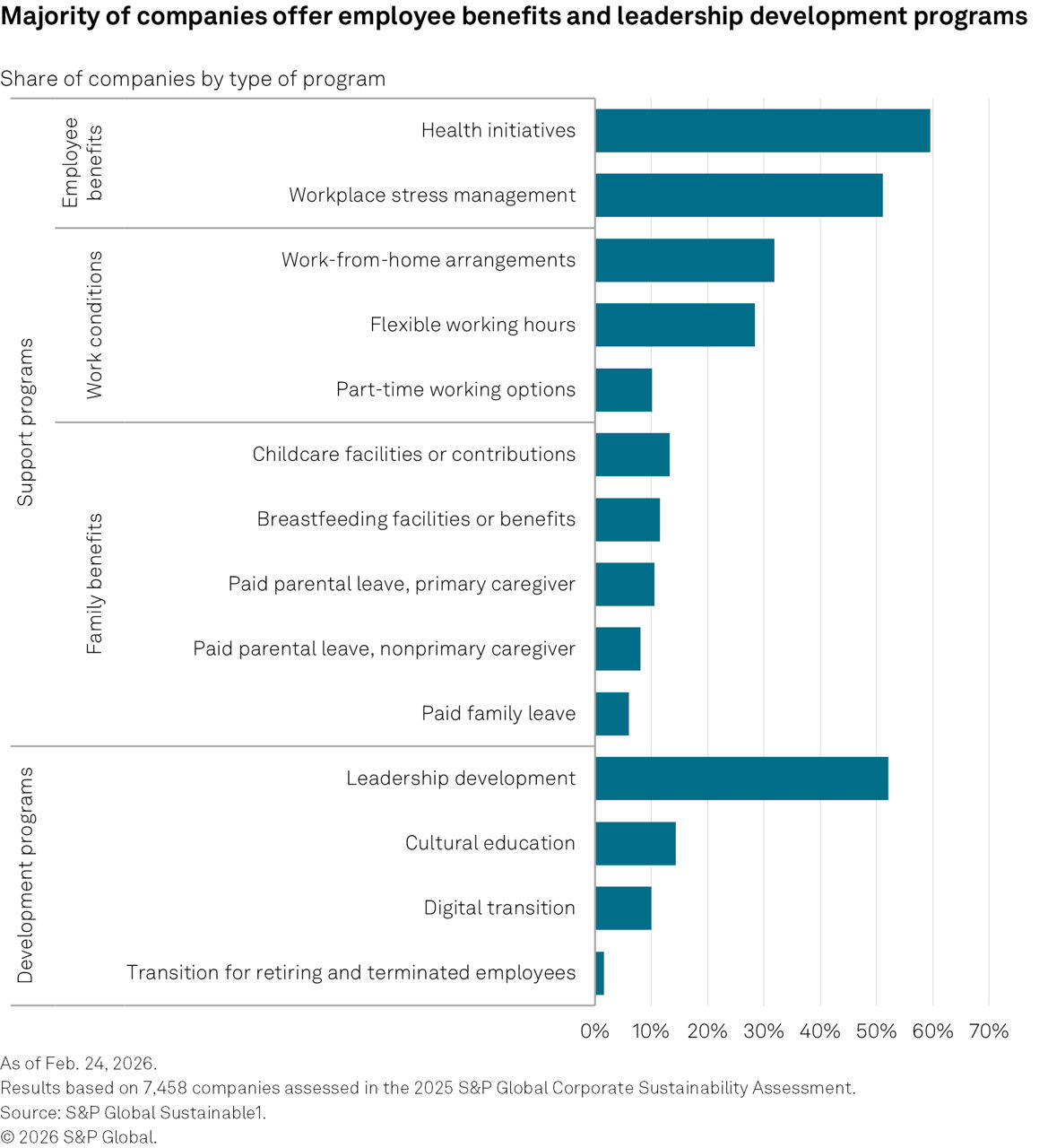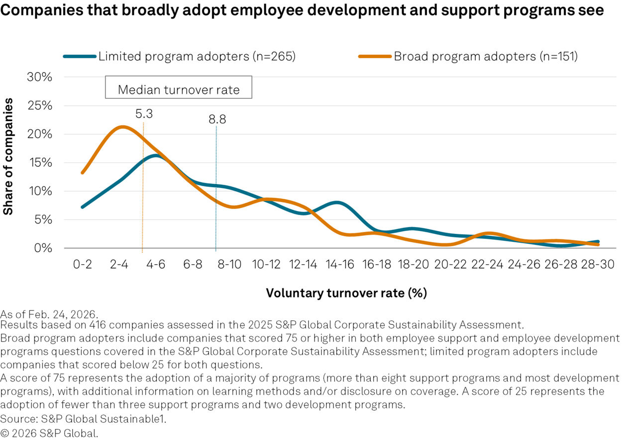 Within our ESG Scores and Raw Data, underpinned by the S&P Global Corporate Sustainability Assessment (CSA), we evaluate the extent to which companies are establishing human capital management and support programs for their employees. We also assess companies’ voluntary turnover rates as a percentage of total employees.