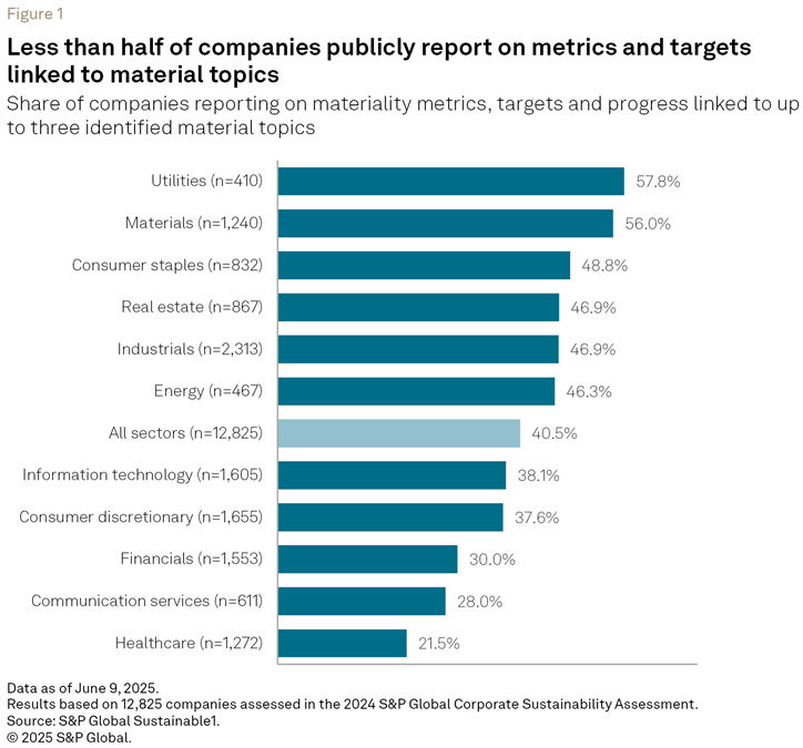 Figure 1 shows that, on average, 40% of companies assessed in 2024 publicly disclosed materiality metrics and their progress in achieving targets linked to material topics. In reporting on established targets or metrics linked to material issues, the utilities sector led the way at 58%, followed by the materials sector at 56%. Disclosure in the real estate, industrials and energy sectors stood at 46%. The healthcare industry had the least disclosure of materiality metrics and progress at 22%.