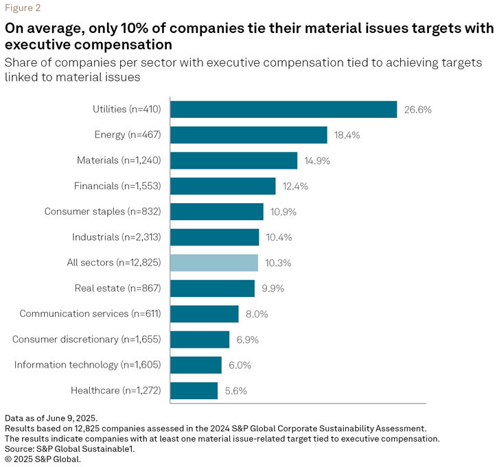 Within our ESG Scores and data, underpinned by the S&P Global Corporate Sustainability Assessment (CSA), we assess whether companies have pinpointed essential metrics associated with their most pressing issues and whether these metrics affect executive committee member compensation.