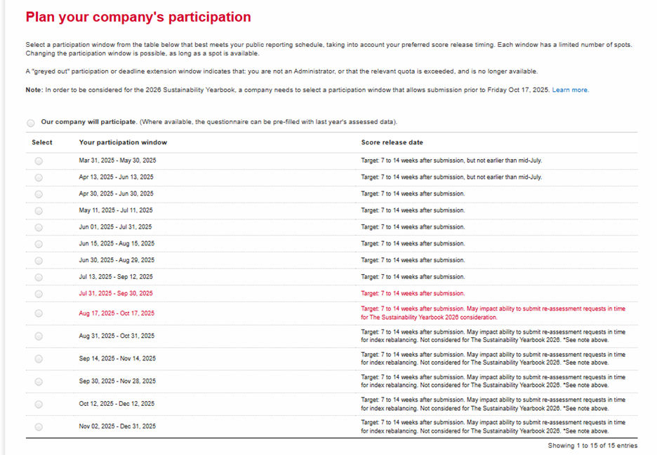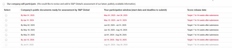 While S&P Global offers different participation windows, each window has a limited quota, and booking is subject to availability. Book early to ensure your company gets the most convenient window to complete the CSA, meeting your public reporting cycle and team availability.