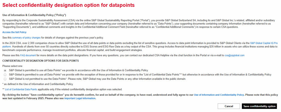 | S&P Global is permitted to use all Data Points* we provide with the exception of those provided for or in response to the "List of Confidential Data Points"** but otherwise in accordance with the Use of Information & Confidentiality Policy. | Datapoint level information for all question types. | Supporting documents and comments made in the “additional confidential comments” field. Datapoints included within the List of Confidential Data Points. |