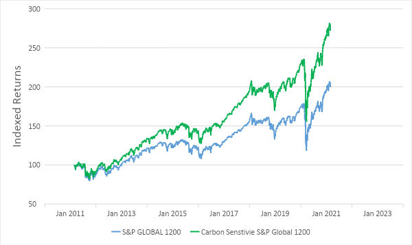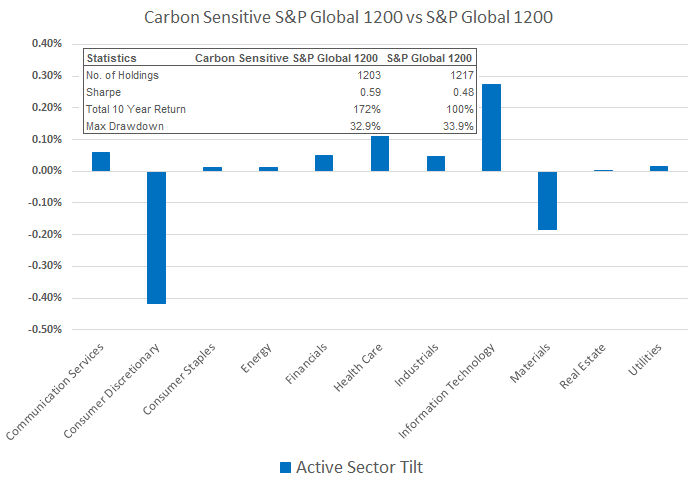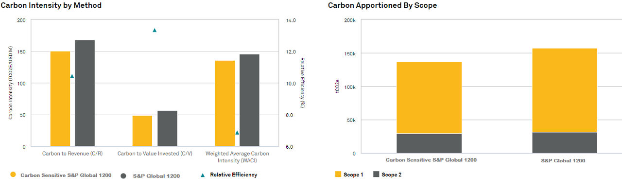 In Exhibit 1, we show the C/R, C/V, WACI and Apportioned Carbon Emissions of the carbon-sensitive S&P Global 1200 and the S&P Global 1200. We see that the carbon-sensitive S&P Global 1200 has 10.43% lower C/R Intensity, 13.3% lower C/V Intensity, 6.9% lower WACI and 13.1% lower apportioned carbon emissions (as of March 2021) at 136,000 tons of Co2.